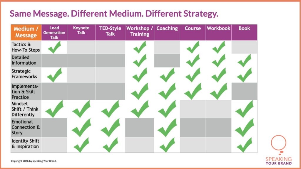 A keynote is not a course. A lead generation talk is not a workshop. A TED-style talk is not a coaching session. A workbook is not a book.